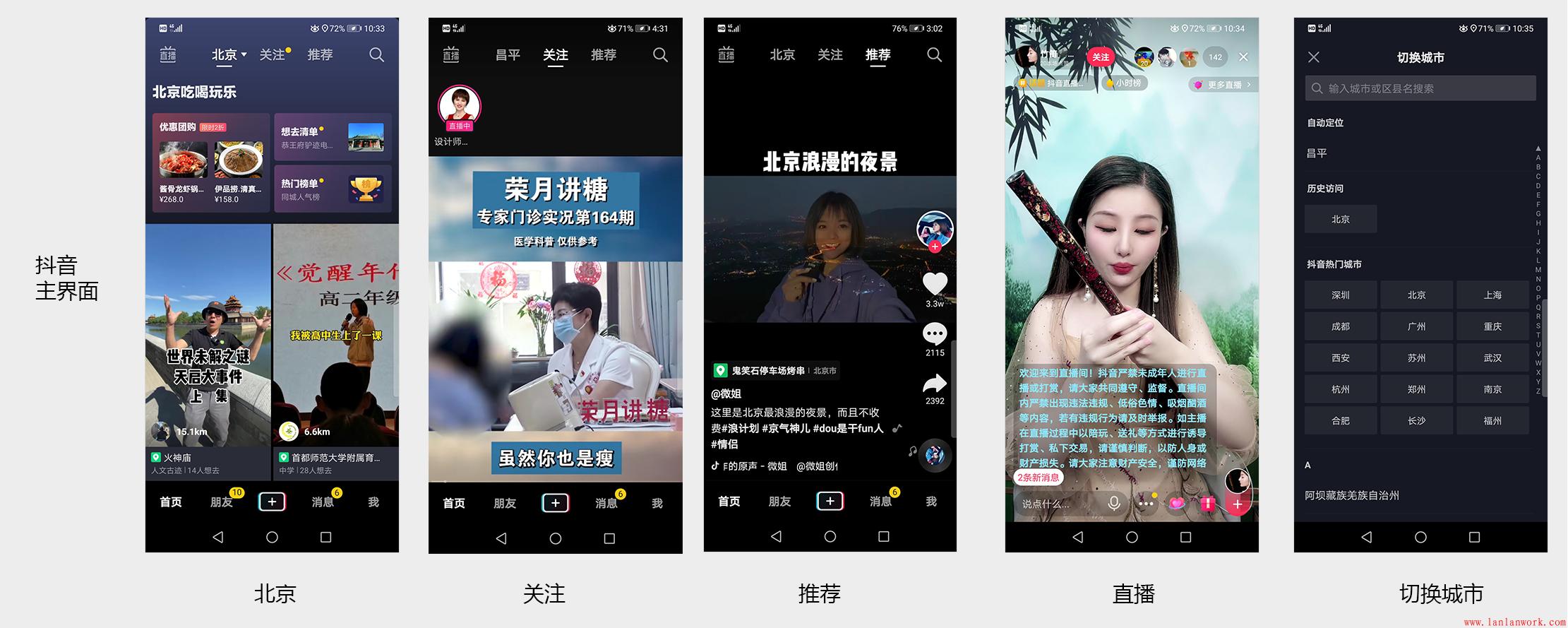 在內(nèi)容的布局上,抖音基本上各欄目就是一頁寬度放一個(gè)視頻,北京欄目下部放了2列。刷一次屏得到一個(gè)內(nèi)容,相對(duì)選擇性差。對(duì)于新用戶,這可能是個(gè)盲點(diǎn)。