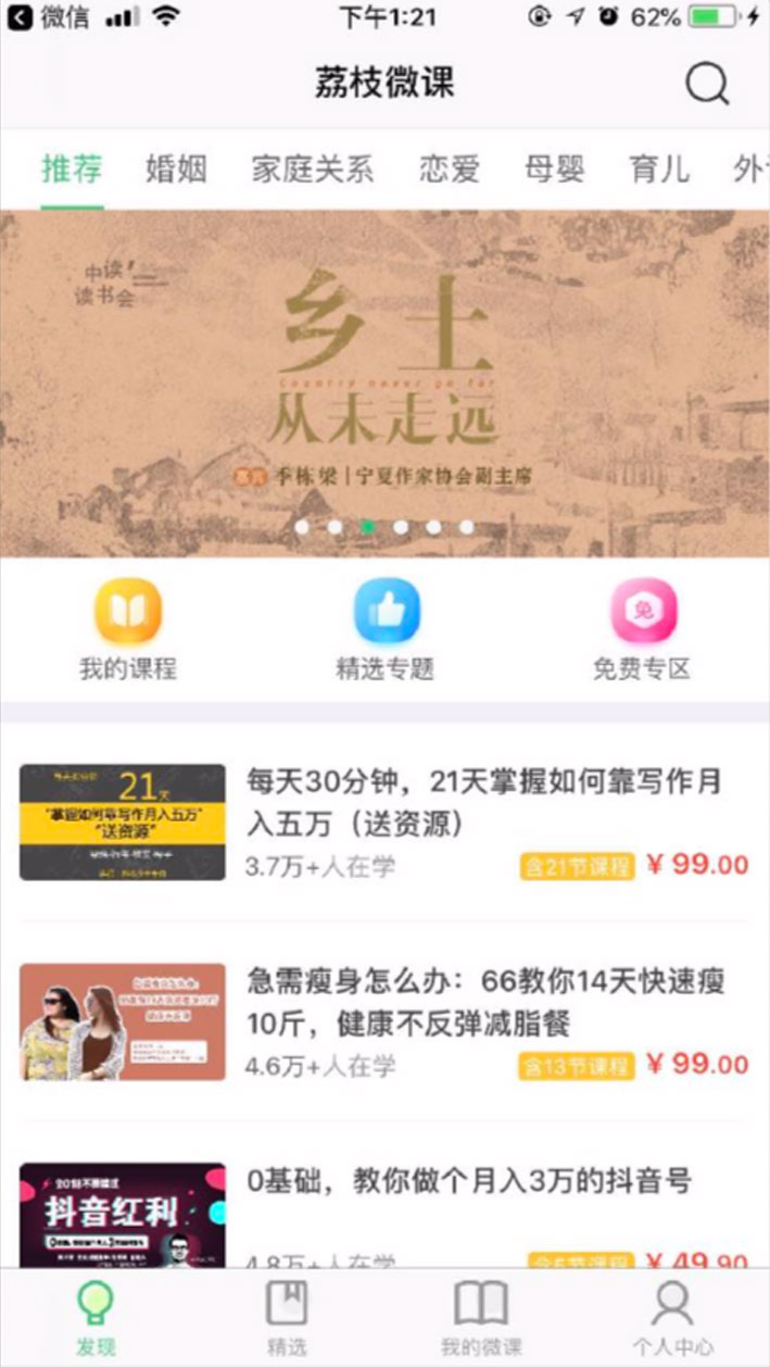3.中間以三個圖標按鈕表示我的課程,精選專題,免費專區(qū)快捷入口方便用戶來回 切換;