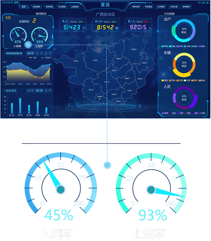 儀表盤:入網(wǎng)率和上線率用儀表盤的形式來展示,整體增加了整個頁面的科技感。兩個儀表盤 分別采用藍、青兩種比較亮的顏色同是也有輕微的漸變。儀表盤沒有全部封閉,下邊由數(shù)字顯示當(dāng) 前具體的百分比。